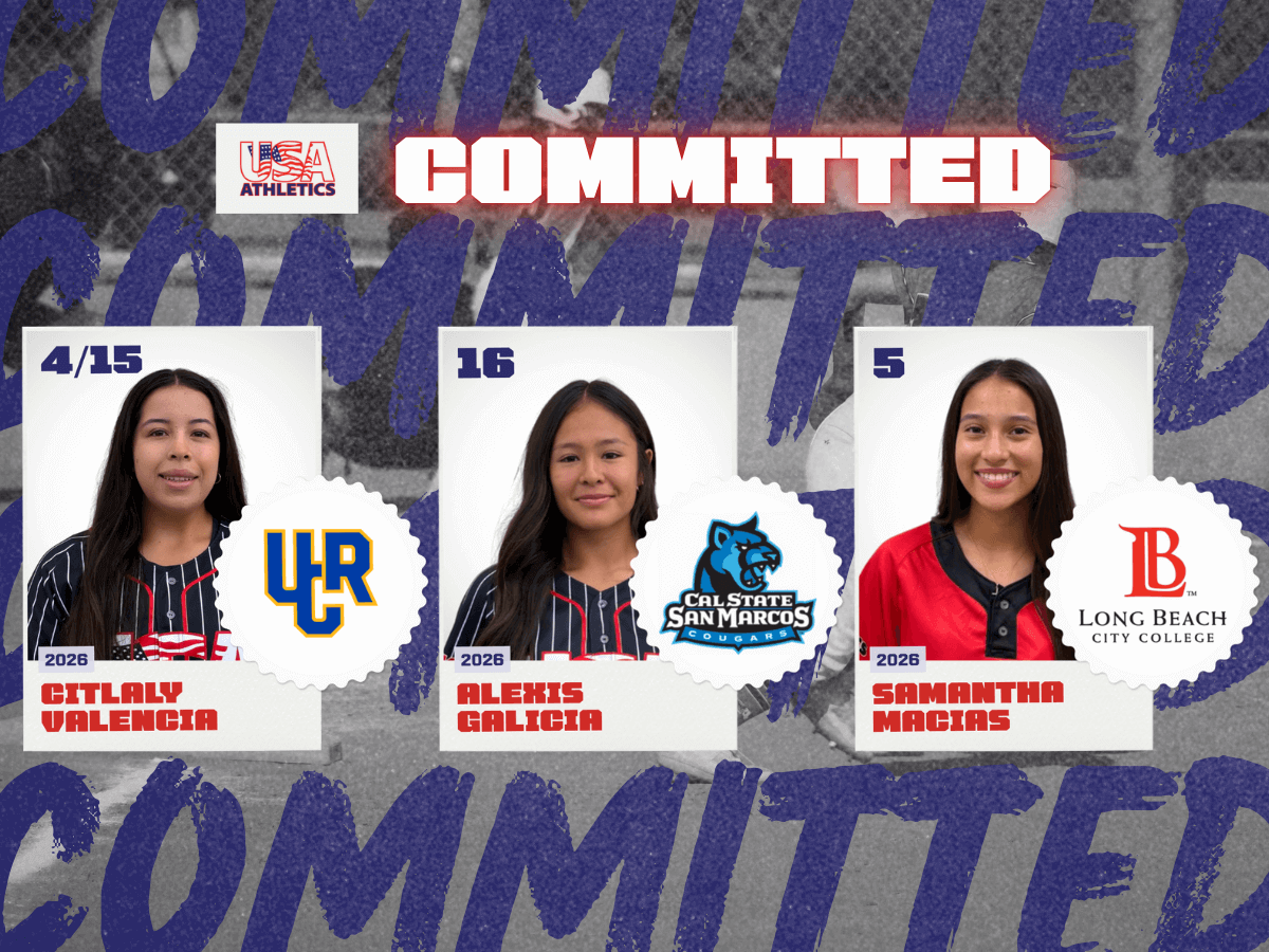 USA Athletics announces three Class of 2026 college commitments: Citlaly Valencia to UC Riverside, Alexis Galicia to Cal State San Marcos, and Samantha Macias to Long Beach City College.